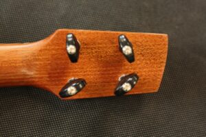 The fretboard is pao ferro and has mother of pearl dots at the 5th, 7th and 10th frets. It has a corian nut and saddle and is fitted with DerJung tuners and fluorocarbon strings.