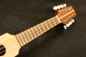 My travel mandolin has as a 14″ scale length and a nut width of 30mm.